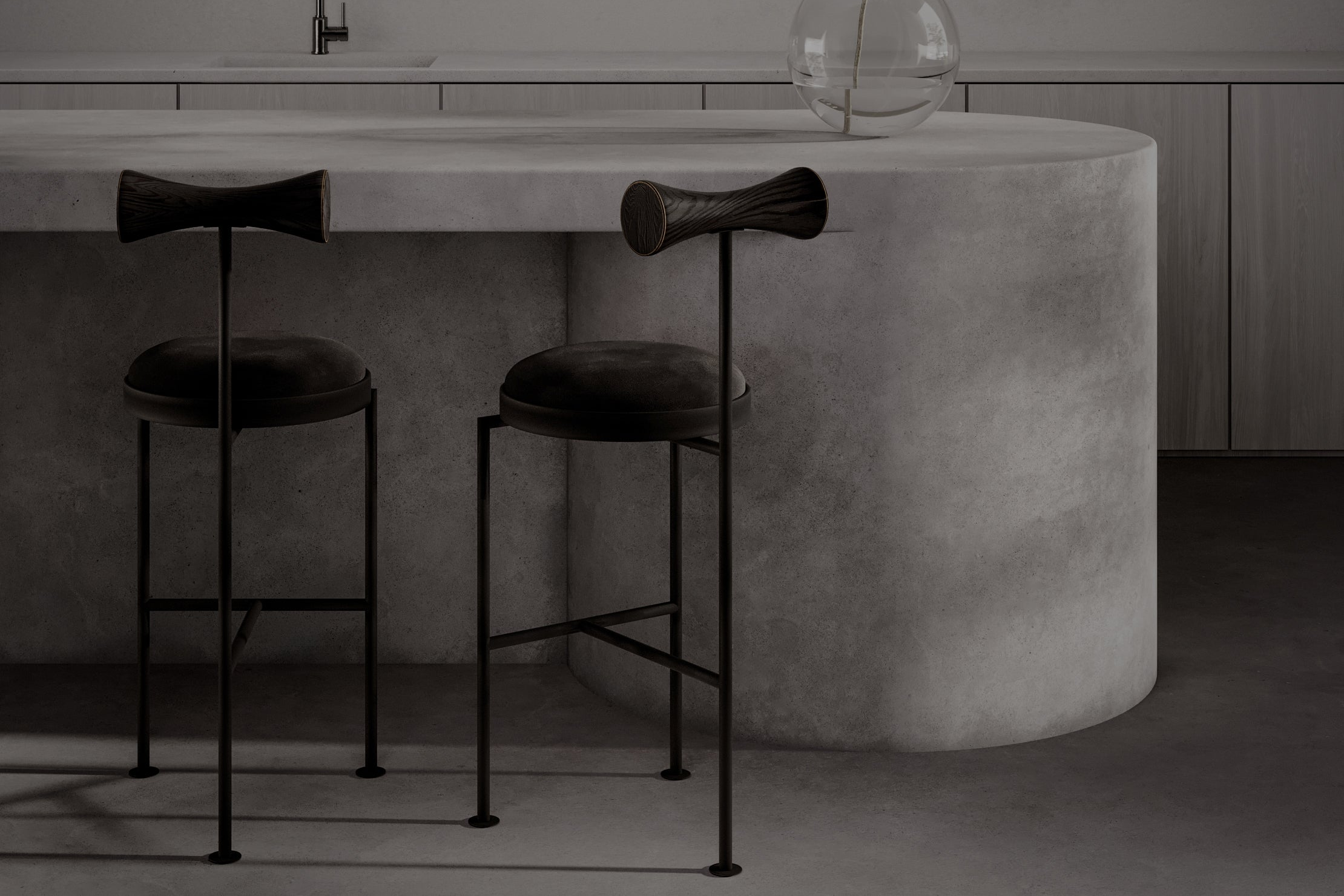 Hoker Velno z kolekcji FEROÉ to wyjątkowe zestawienie kontrastujących materiałów i subtelnej formy. Stabilna, metalowa podstawa spotyka się tu z miękkim, alcantarowym siedziskiem w czarnym kolorze, które zapewnia komfort nawet podczas dłuższego użytkowania. Całość dopełnia profilowane, drewniane oparcie przecierane i bejcowane na czarno, dodając lekkości i charakteru. Ten stylowy mebel doskonale uzupełni kuchenną wyspę lub domowy bar, wnosząc do wnętrza nowoczesność z wyraźnym akcentem naturalności.