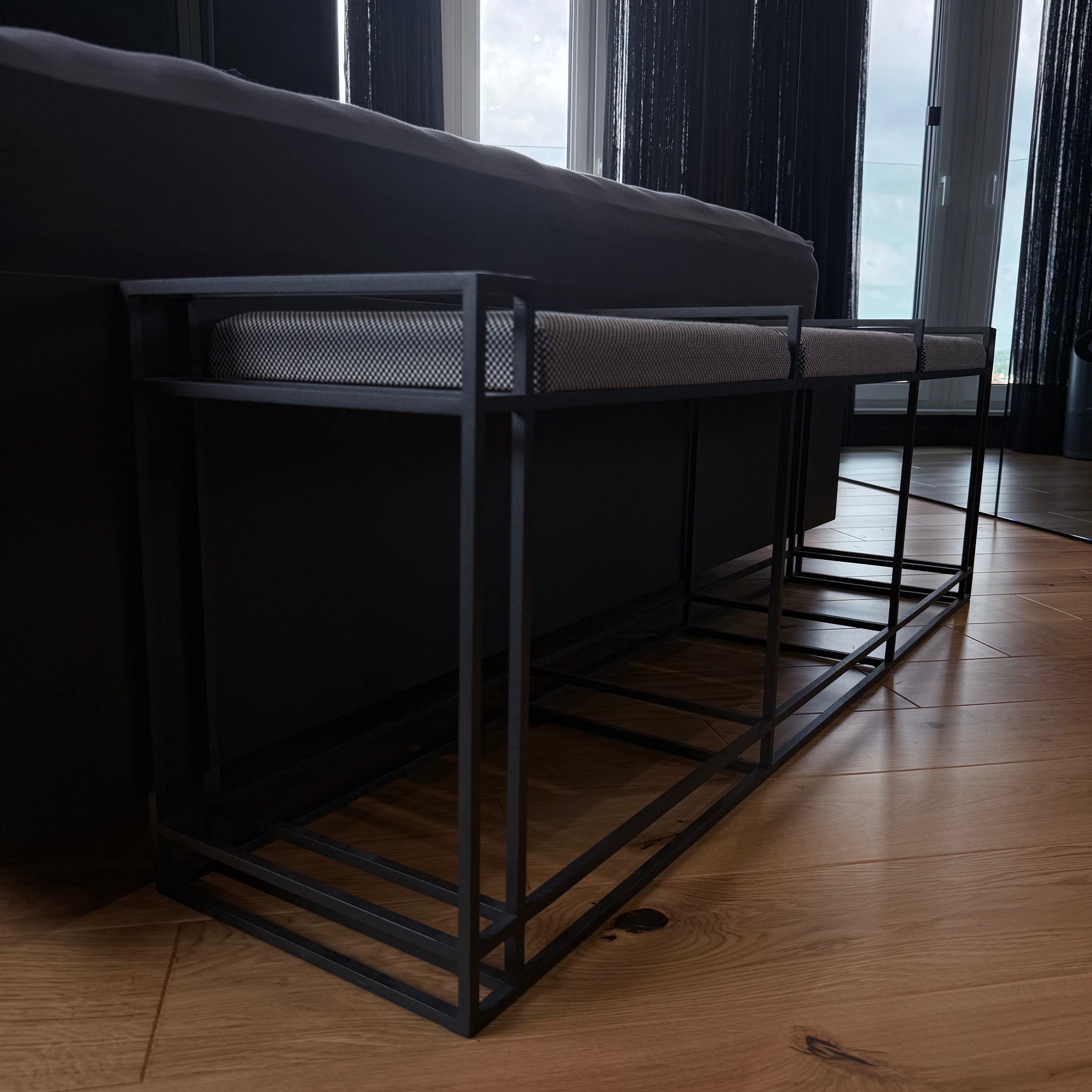 Ławka składa się z trzech zintegrowanych segmentów, co jest jej cechą definiującą. Każdy segment wyposażono w kwadratowe siedzisko z tapicerką o wzorzystej fakturze. Kontrast teksturalny pomiędzy twardym metalem a miękką tapicerką jest kluczowym elementem estetycznym.