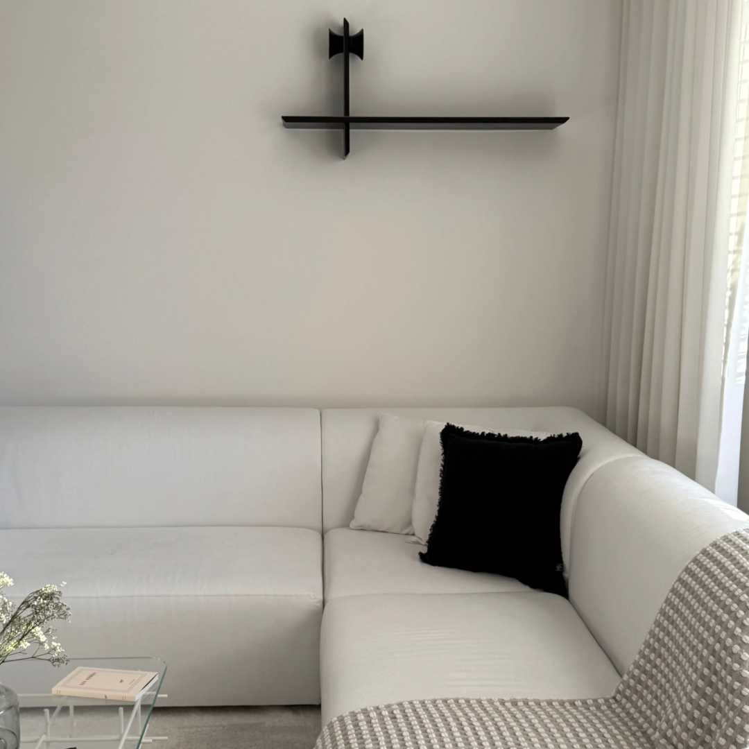 Minimalistyczna półka ścienna oparta na smukłej, horyzontalnej linii i charakterystycznym wsporniku o rzeźbiarskim profilu. Jej lekka optycznie forma wynika z napięcia pomiędzy cienkim blatem, a pionowym elementem montażowym, oba elementy mają ścięte krawędzie, co podkreśla precyzję wykonania i nadaje całości wyraz graficzny.